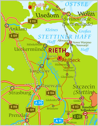 fahren Sie in Richtung Altwarp bis Vogelsang-Warsin, dann