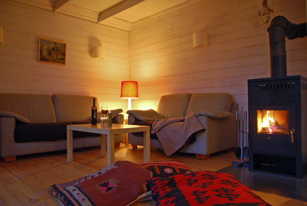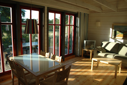 Aus jedem Zimmer können Sie auf die umlaufende Terrasse gelangen. Gartenmöbel und ein Grill stehen auch zur Verfügung. Die Häuser sind mit Kaminöfen und E- Direktheizungen ausgestattet.